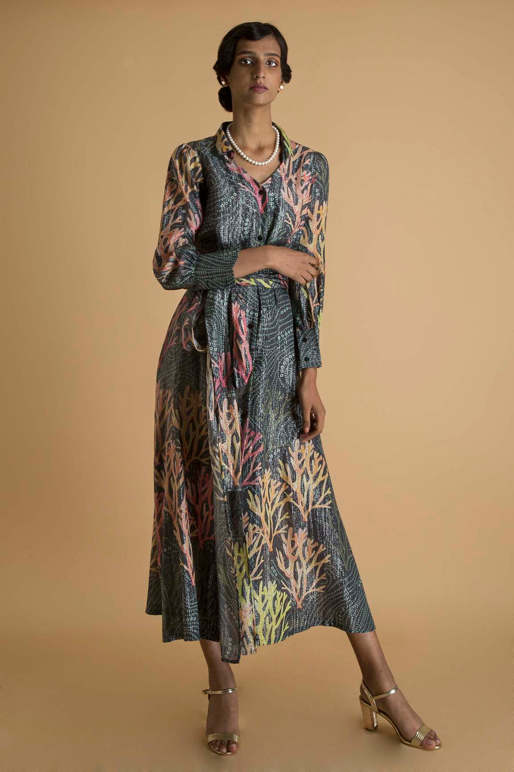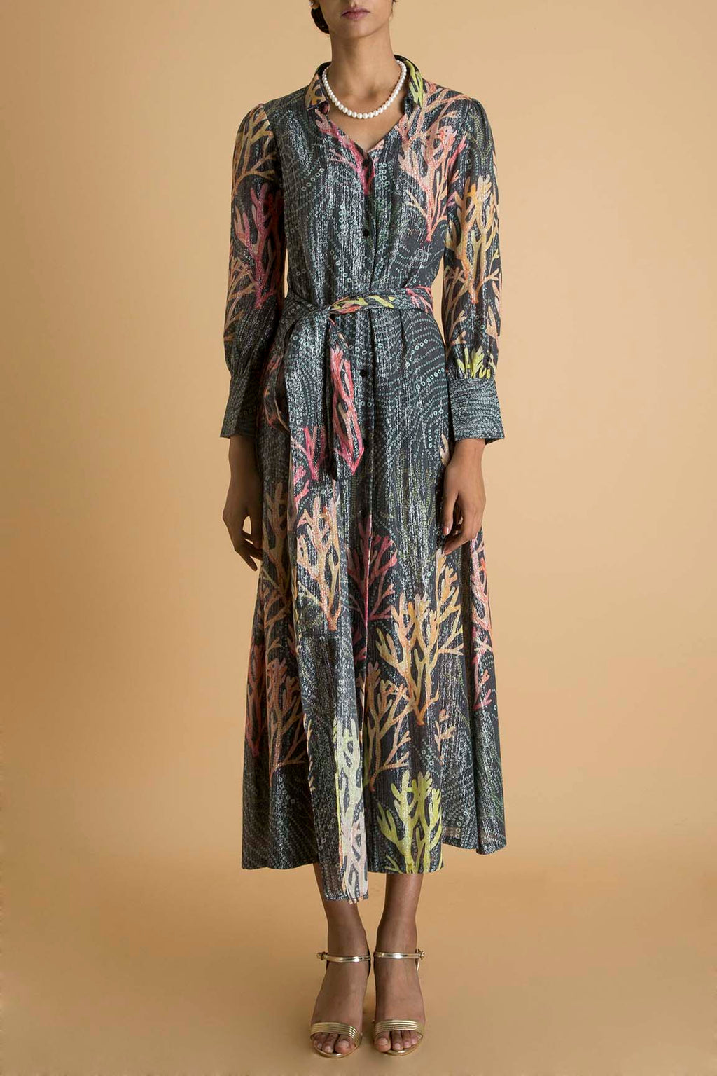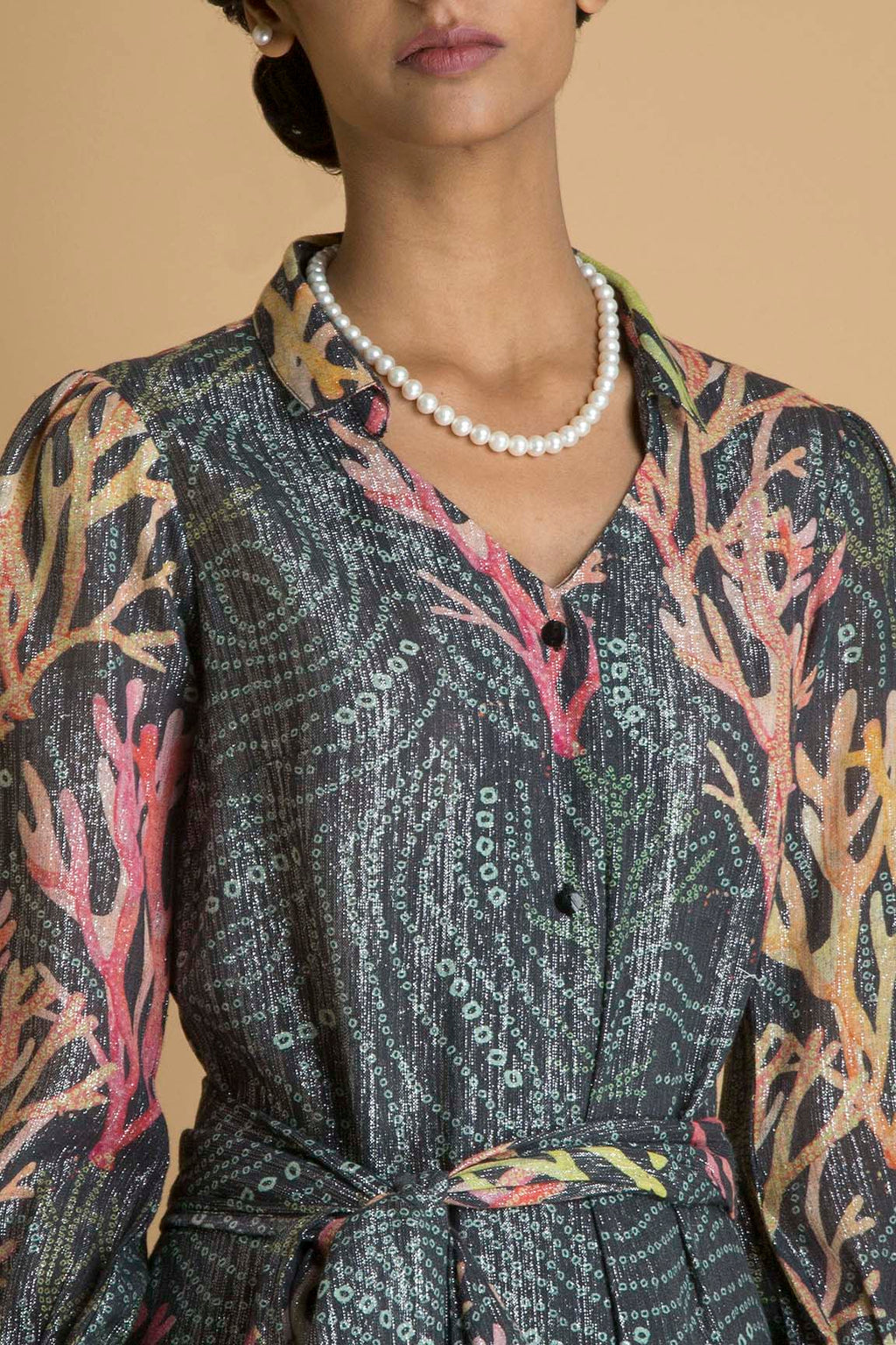 - This breezy dress features rich coral pattern in vibrant contrasting hues on metallic cotton.