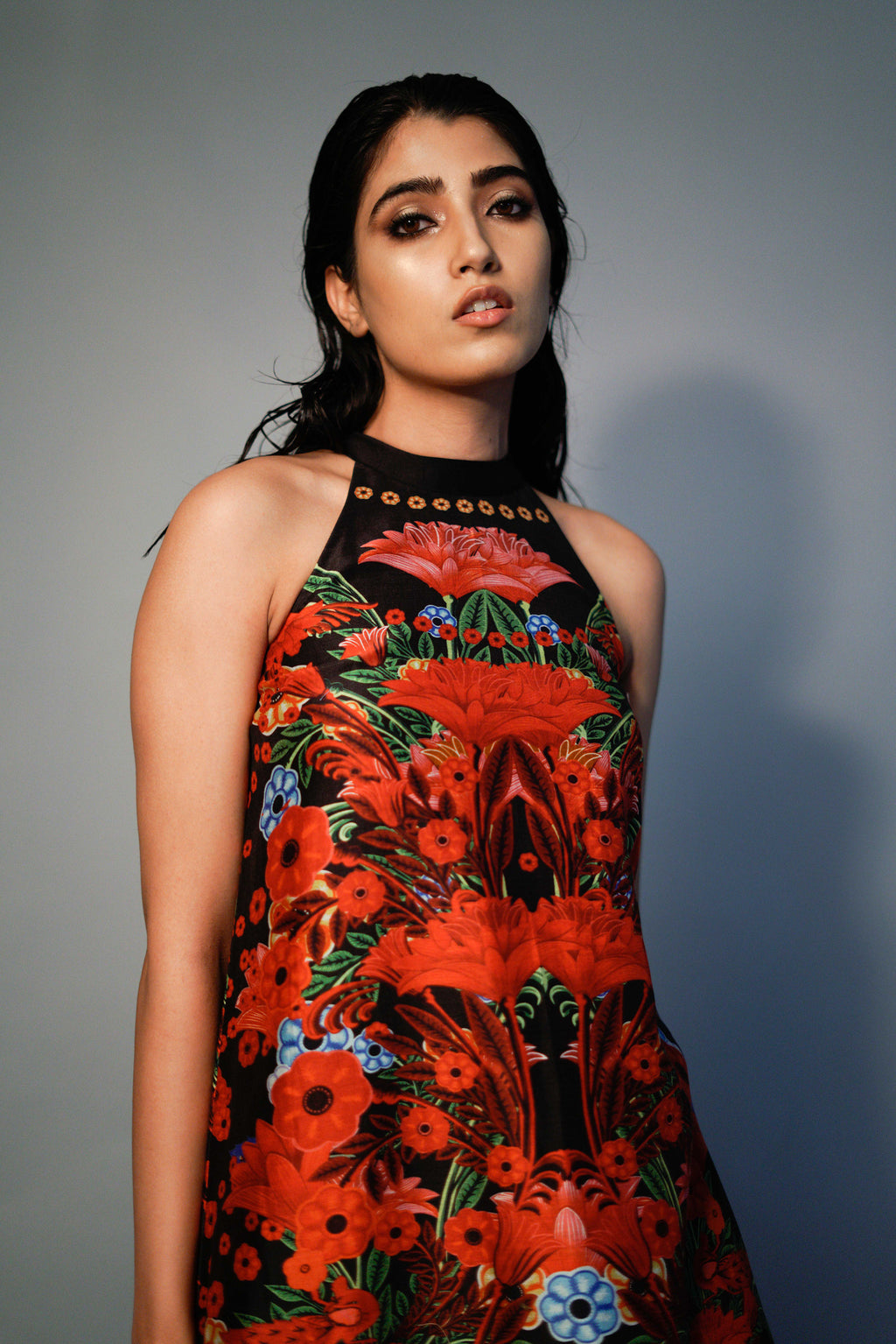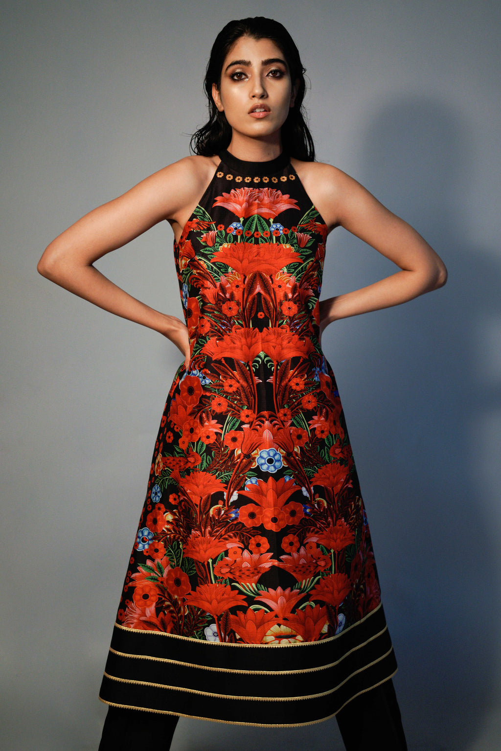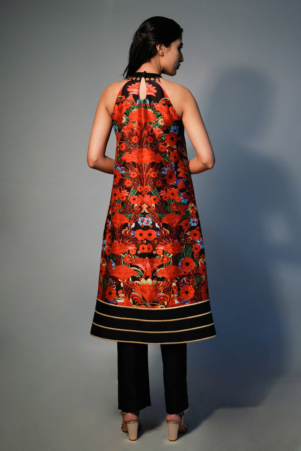 Red and Black Halter Neck Printed Kurta Set in Chanderi Cotton Silk