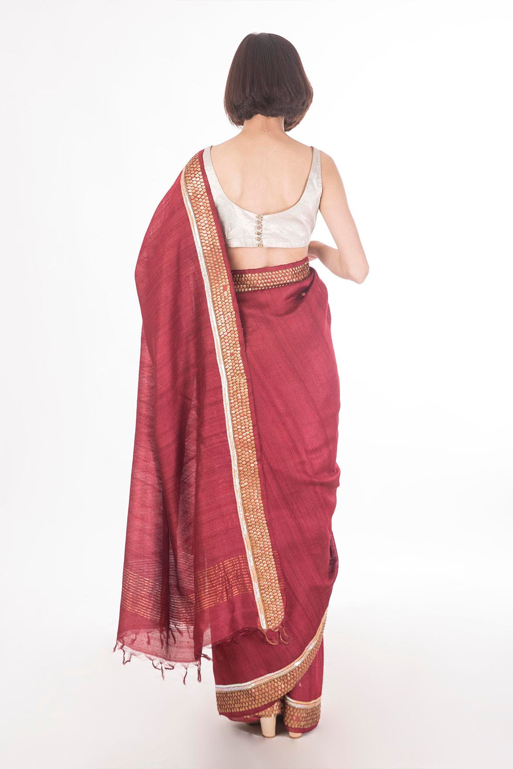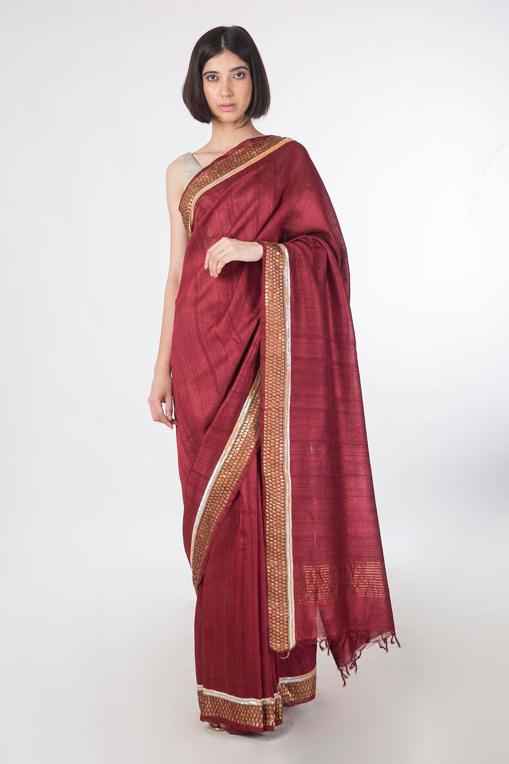 - The golden border is accentuated with tonal golden hand embroidery enhancing the deep red tussar silk base.