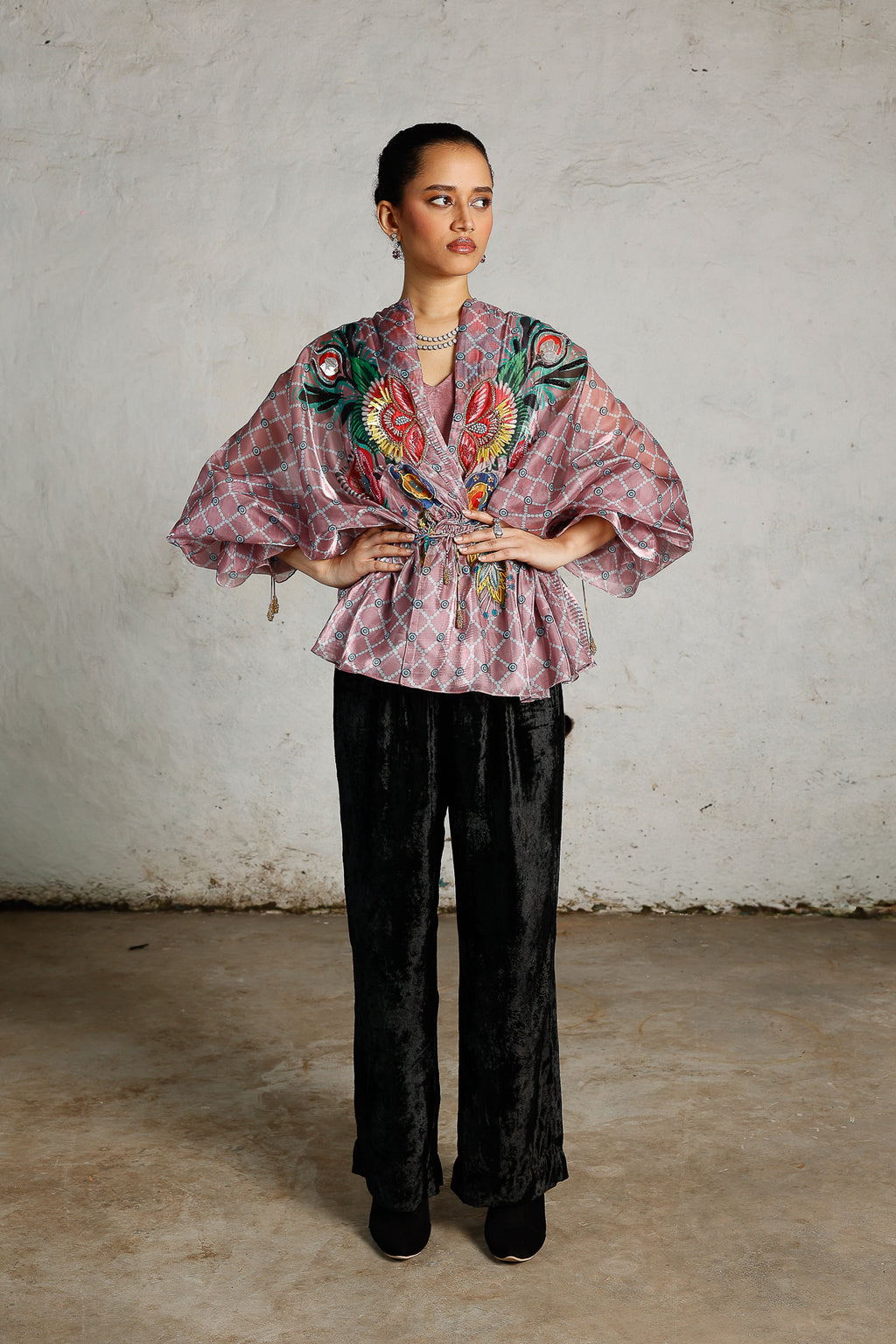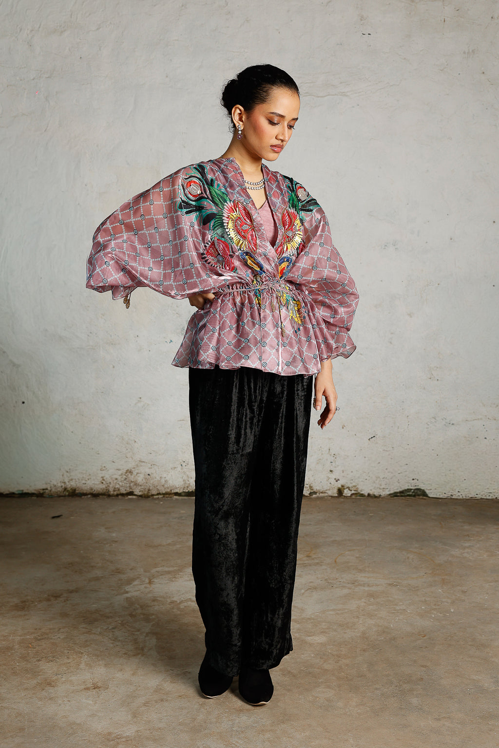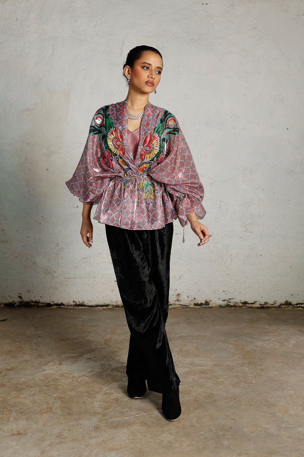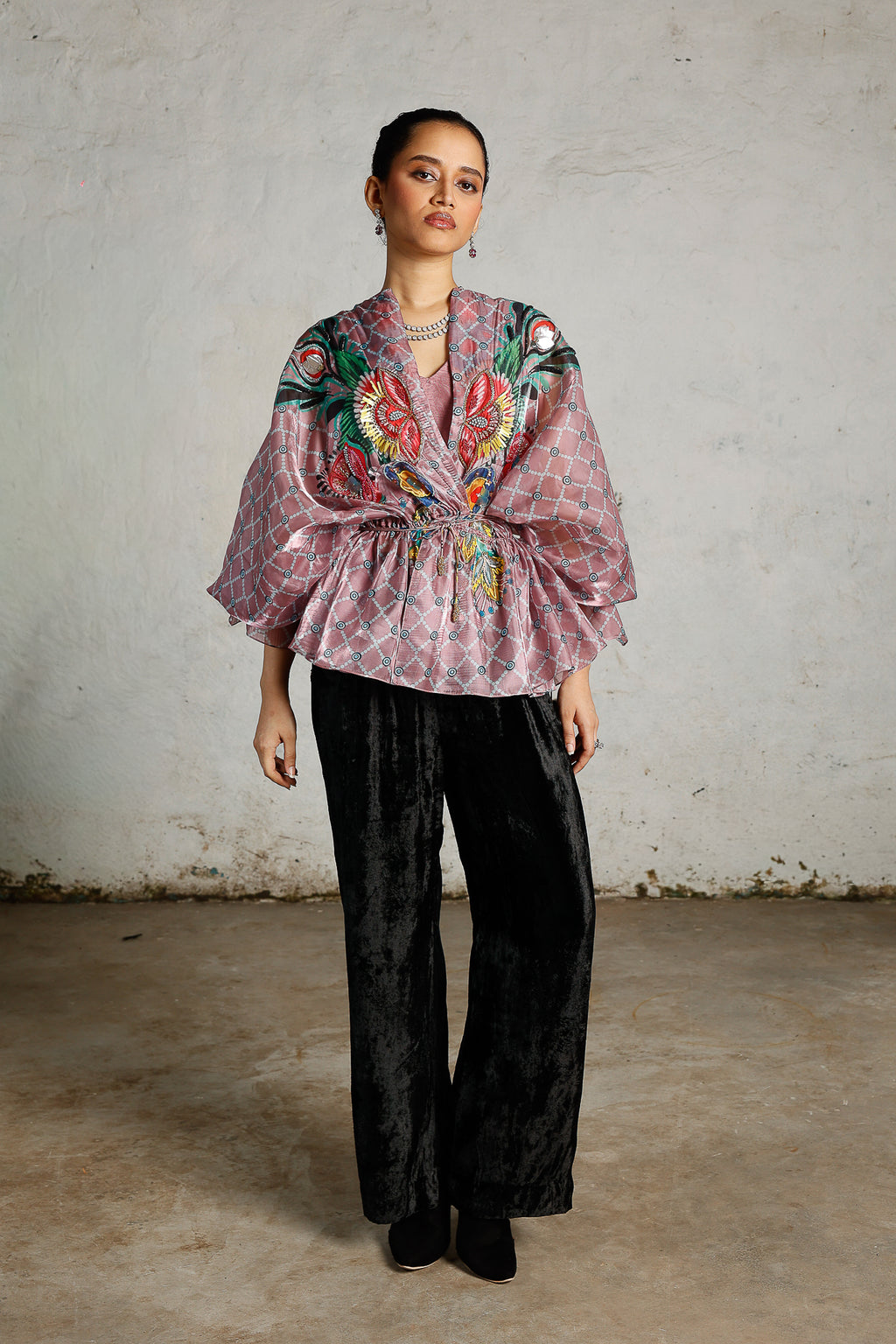 PINK PRINTED & EMBROIDERED KAFTAN IN SATIN ORGANZA WITH VISCOSE DUPION BUSTIER
