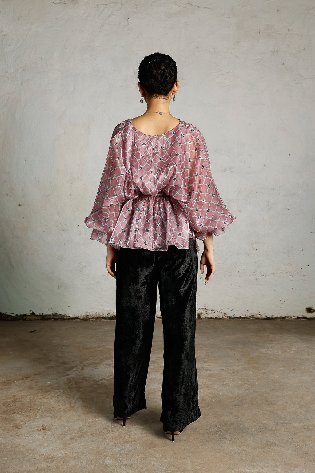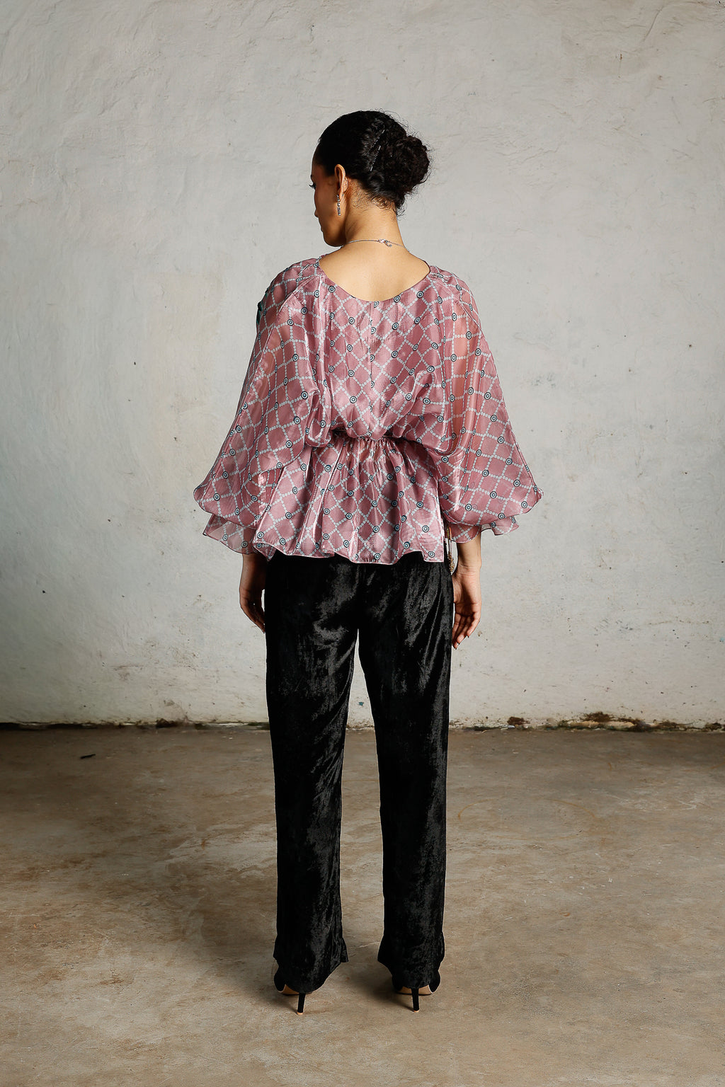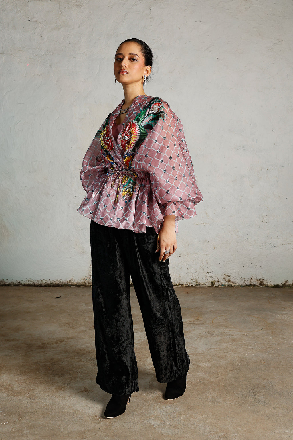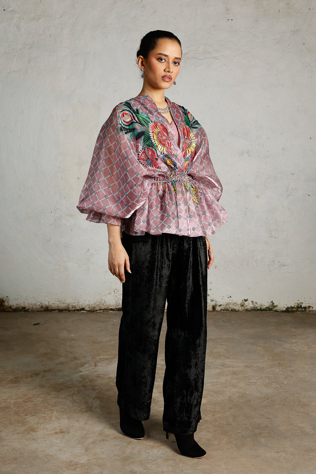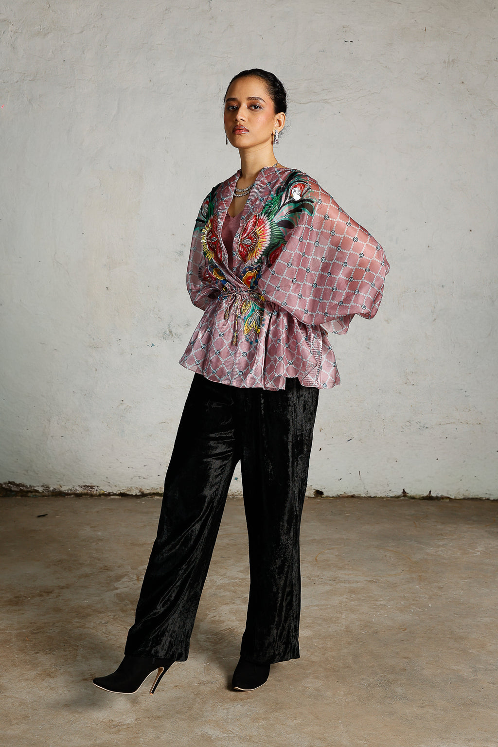 PINK PRINTED & EMBROIDERED KAFTAN IN SATIN ORGANZA WITH VISCOSE DUPION BUSTIER